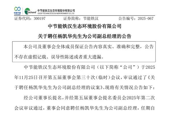 中节能铁汉生态环境股份有限公司(简称:节能铁汉)公告称,公司于2025年11月25日召开第五届董事会第三十次(临时)会议,审议通过了《关于聘任杨凯华先生为公司副总经理的议案》。经公司董事长提名,并经第五届董事会提名委员会2025年第二次会议审议通过,董事会同意聘任杨凯华先生为公司副总经理,任期自本次董事会审议通过之日起至第五届董事会届...