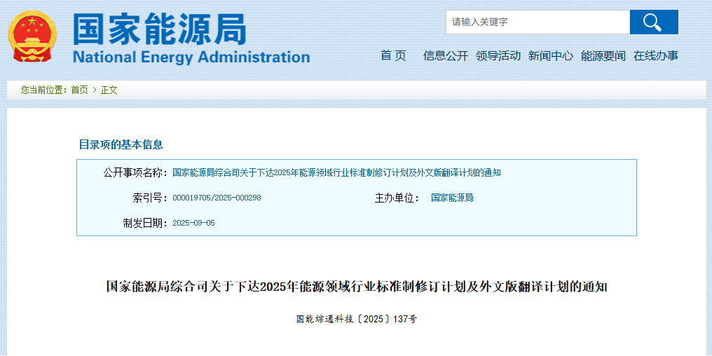 近日,国家能源局在发布了关于下达关于《2025年能源领域行业标准制修订计划及外文版翻译计划》的通知。 文件指出:根据国家能源局2025年标准化工作安排,现下达2025年能源领域行业标准制定计划(共计801项)、标准修订计划(共计402项)及外文版翻译计划(共计64项)。请组织各有关标准化技术委员会、标准起草单位、翻译工作承担单位抓好...