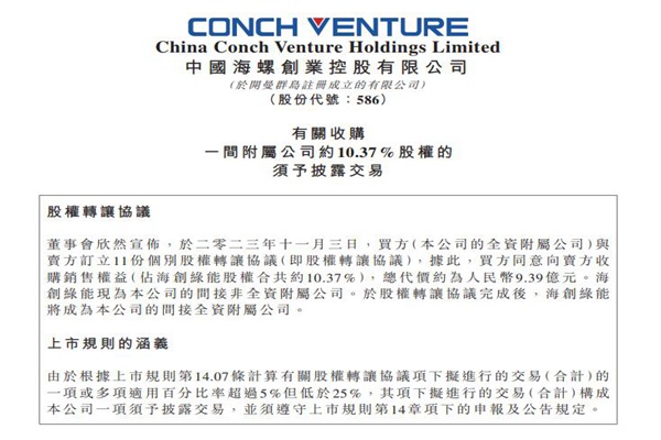 11月3日,海螺创业(全称:中国海螺创业控股有限公司)发布公告称,全资附属公司芜湖海创将以9.39亿元人民币收购海创绿能约10.37%股权。交易完成后,海创绿能将成为海螺创业间接全资附属公司。 据悉,海创绿能及其附属公司主要从事营运垃圾发电项目,包括投资、设计、开发及生产、安装及营运城市固废处理项目,并提供焚烧城市生活垃圾及在焚烧过...
