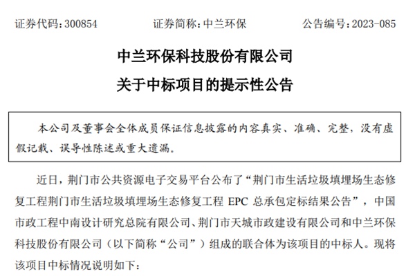 近日,荆门市公共资源电子交易平台公布了“荆门市生活垃圾填埋场生态修复工程荆门市生活垃圾填埋场生态修复工程 EPC 总承包定标结果公告”,中国 市政工程中南设计研究总院有限公司、荆门市天城市政建设有限公司和中兰环保 科技股份有限公司组成的联合体为该项目的中标人。 根据中兰环保发布的公告显示,该项目中标价约1.1...