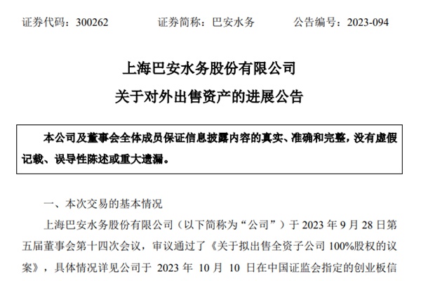 主营工业水处理、市政水处理、固体废弃物处理三大板块,专业从事环保能源领域的智能化、全方位技术解决方案的运营服务商上海巴安水务股份有限公司近日公布对外出售资产的新进展。(相关阅读→) 公司出售全资子公司SWT的100%股权的事项已完成全部交付工作。截至本公告披露之日,交易对方已按照合同约定向公司支付股权转让款 480 万美元...
