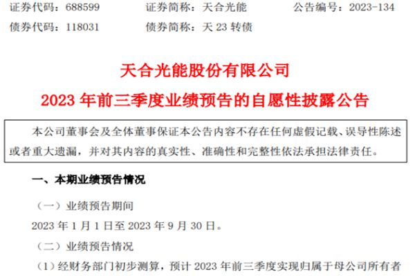 10月8日晚间,天合光能发布了2023年前三季度业绩预喜公告。 天合光能预计,今年前三季度,公司可实现归母净利润45.63亿-55.77亿元,同比增长89.94%-132.15%;扣非净利润46.75亿-56.89亿元,同比增加108.64%-153.90%。 据半年报显示,天合光能1-6月归母净利润为35.4亿元,这意味着今年第...
