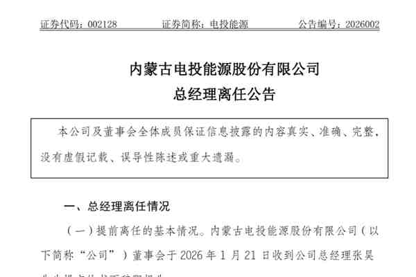内蒙古电投能源股份有限公司(简称:电投能源)公告称,公司董事会于2026年1月21日收到公司总经理张昊先生提交的书面辞职报告。 据悉,因工作变动原因,张昊先生辞去电投能源总经理职务,原定第八届经理层任职期限为2024年9月14日至2027年9月11日。张昊先生辞去总经理职务后,不再电投能源及其控股子公司担任职务,不持有公司股份 电...
