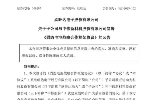欣旺达电子股份有限公司(简称:欣旺达)近日公告称,子公司欣旺达动力科技股份有限公司(下称“欣旺达动力”)和中伟新材料股份有限公司(下称“中伟股份”)就建立战略合作关系而签署《固态电池战略合作框架协议》。此次合作基于双方在战略合作方面的互补性和兼容性,为充分发挥双方技术、工程、资源、产线及...