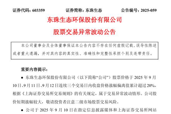 2025年9月10日、9月11日、9月12日连续三个交易日内,东珠生态环保股份有限公司(简称:东珠生态)收盘价格涨幅偏离值累计超过20%。对此,东珠生态发布股票交易异常波动公告,提示投资者注意二级市场股票交易风险。 东珠生态表示,公司正在筹划以发行股份及支付现金的方式收购凯睿星通信息科技(南京)股份有限公司(下称“凯睿星...