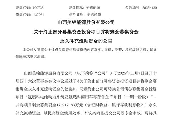 山西美锦能源股份有限公司(简称:美锦能源)公告称,公司于2025年11月7日召开十届四十六次董事会会议,审议通过了《关于终止部分募集资金投资项目并将剩余募集资金永久补充流动资金的议案》,同意终止公司可转换公司债券募集资金投资项目“氢燃料电池动力系统及氢燃料商用车零部件生产项目(一期一阶段)”,并将项目剩余募集资...