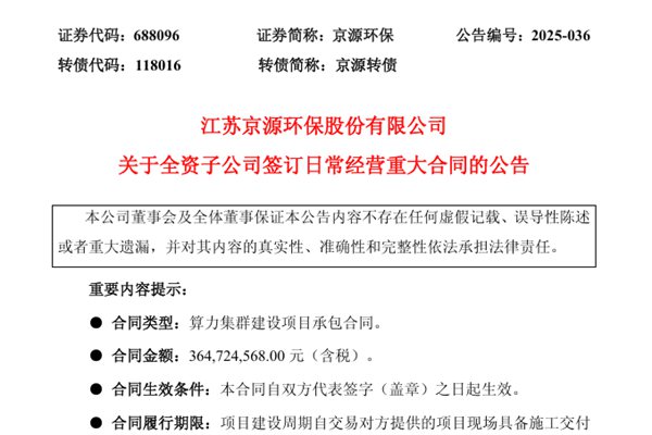 江苏京源环保股份有限公司(简称:京源环保)发布公告称,公司全资子公司南通京源云计算科技有限公司(以下简称“京源云计算”)近日签署了算力集群建设项目承包合同,合同金额364,724,568.00 元(含税),将采用总额法确认收入,2025年项目交付验收完成后一次性确认收入约32,026 万元,运维服务部分将按5年...