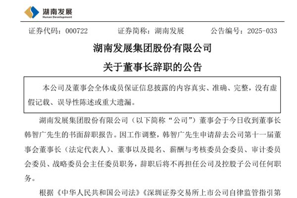 湖南发展集团股份有限公司(简称:湖南发展)近日公告称,因工作调整,韩智广先生申请辞去公司第十一届董事会董事长(法定代表人)、董事以及提名、薪酬与考核委员会委员、审计委员会委员、战略委员会主任委员职务,辞职后将不再担任公司及控股子公司任何职务。图源:湖南发展公告 湖南发展主要从事清洁能源及自然资源相关业务,2024年实现营业收入为3....