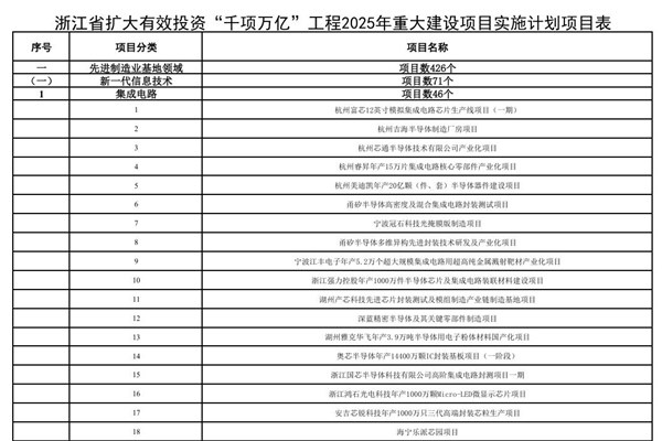 浙江省发展和改革委员会印发浙江省扩大有效投资“千项万亿”工程2025年重大建设项目实施计划项目表,先进制造业基地领域项目数426个,科技创新强基领域项目数188个,交通强省领域项目数185个,水网安澜提升领域项目数100个,清洁能源保供领域项目数85个,城镇有机更新领域项目数101个,农业农村优先领域项目数51...