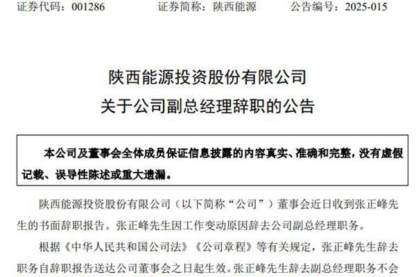 陕西能源投资股份有限公司(简称:陕西能源)近日公告称,公司董事会近日收到张正峰先生的书面辞职报告。张正峰先生因工作变动原因辞去公司副总经理职务。 陕西能源是陕西投资集团有限公司控股的大型煤电一体化企业,是国务院国资委确定的第一批深化国企改革“双百企业”。 近年来,陕西能源致力于煤炭清洁高效开采与电力绿色转化,...