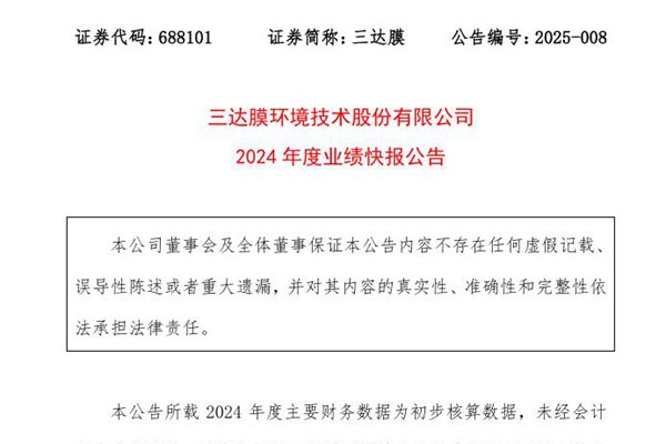 三达膜环境技术股份有限公司(简称:三达膜)近日发布《2024 年度业绩快报公告》。快报显示,三达膜2024年实现营业收入14.18亿元,同比下降2.27%;归母净利润3.12亿元,同比增长22.94%;扣非净利润2.77亿元,同比增长19.8%;基本每股收益0.94元。 三达膜的主营业务包括工业料液分离、产品分离纯化、废...