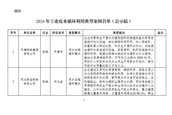 2024年工业废水循环利用典型案例名单公示 按照《工业和信息化部办公厅关于开展2024年工业废水循环利用典型案例征集工作的通知》(工信厅节函〔2024〕280号)要求,经企业和园区申报、地方推荐、专家评审,确定了2024年工业废水循环利用典型案例名单。现将名单进行公示,如有异议,请在公示期内与我们联系,并提交相关证明材料。 公示时间:...