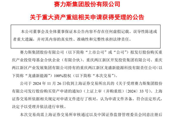 11月26日至27日,赛力斯集团股份有限公司连发多份公告,通报关于并购重组的事项。图源:赛力斯公告(下同) 《关于重大资产重组相关申请获得受理的公告》称,赛力斯拟发行股份购买重庆产业投资母基金合伙企业(有限合伙)、重庆两江新区开发投资集团有限公司、重庆两江新区产业发展集团有限公司持有的重庆两江新区龙盛新能源科技有限责任公司100%股...