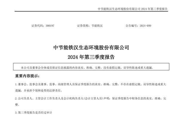 中节能铁汉生态环境股份有限公司(下称“节能铁汉”)近日发布《2024年三季度报告》。报告显示,节能铁汉2024年前三季度营收约9.63亿元,同比减少36.48%;归属于上市公司股东的净利润亏损约6.33亿元,同比减少110.35%;基本每股收益亏损0.2313元。 据介绍,节能铁汉主营业务为生态环保和环境治理...