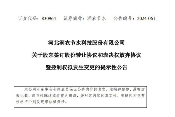 10月25日晚,河北润农节水科技股份有限公司(简称:润农节水)发布《关于股东签订股份转让协议和表决权放弃协议暨控制权拟发生变更的提示性公告》。根据该公告,润农节水实控人薛宝松、李明欣及其一致行动人拟向湖北省乡村振兴投资集团有限公司(简称:湖北乡投集团)转让所持股份,并放弃部分股份表决权。 本次变更完成后,湖北乡投集团将成为润农节水表...