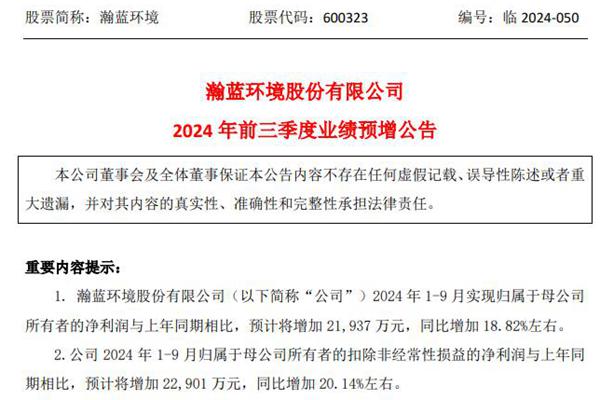 瀚蓝环境股份有限公司(简称:瀚蓝环境)近日发布《2024 年前三季度业绩预增公告》。 公告显示,瀚蓝环境2024 年 1-9 月实现归属于母公司所有者的净利润与上年同期相比,预计将增加 21,937 万元,同比增加 18.82%左右;归属于母公司所有者的扣除非经常性损益的净利润与上年同期相比,预计将增加 22,901 万元,同比增加...