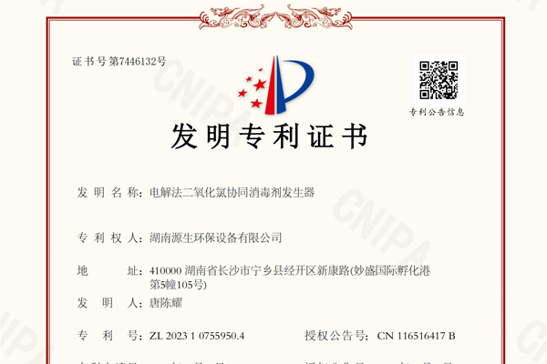 新鲜出炉!湖南源生环保设备有限公司再获一项发明专利证书! 2024年10月18日,国家知识产权局正式向源生智能颁发了电解法二氧化氯协同消毒剂发生器发明专利证书,发明专利号202310755950.4。图片由源生智能提供,授权发布 匠人精神,铸就卓越品质 天道酬勤,积跬步,至千里。该项专利是源生智能始终以卓越的创新能力和匠人精神,...