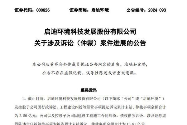 10月16日,启迪环境科技发展股份有限公司(简称:启迪环境)披露涉及诉讼(仲裁)案件最新进展。截至公告日,启迪环境前期部分公司及相关子公司被列为被告的涉诉案件已取得判决结果或达成和解,执行待履行金额合计约为48.81亿元;公司及控股子公司累计诉讼、仲裁事项金额合计18.31亿元,占公司最近一期经审计净资产的31.39%。 据悉,启迪...