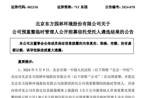 北京东方园林环境股份有限公司(简称:*ST东园)近日发布《关于公司预重整临时管理人公开招募信托受托人遴选结果的公告》,公布临时管理人综合各家信托机构现场选聘阶段评分及竞争性磋商结果,最终选定中信信托有限责任公司与中国对外经济贸易信托有限公司组成信托机构联合体作为公司预重整案信托受托人。 据悉,2024年5月9日,北京市第一中级人民法...