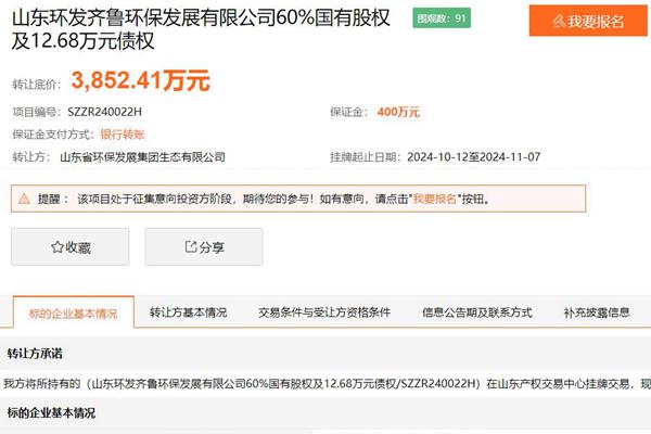 10月12日,山东环发齐鲁环保发展有限公司(下称“齐鲁环保”)60%国有股权及12.68万元债权在山东产权交易中心挂牌,保证金400万元,转让方为山东省环保发展集团生态有限公司,挂牌至11月7日。 齐鲁环保注册资本5000万元,经营范围涵盖固体废物治理;自然科学研究和试验发展;水资源管理;自然生态系统保护管理...