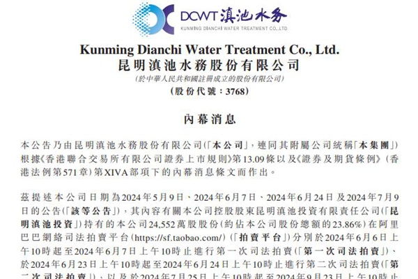 2024年9月23日,昆明滇池水务股份有限公司发布公告,控股股东昆明滇池投资有限责任公司持有的公司24,552万股股份(约占公司股份总额的23.86%)在阿里巴巴网络司法拍卖平台分别于2024年6月6日上午10时起至2024年6月7日上午10时止进行第一次司法拍卖、于2024年6月23日上午10时起至2024年6月24日上午10时止进...