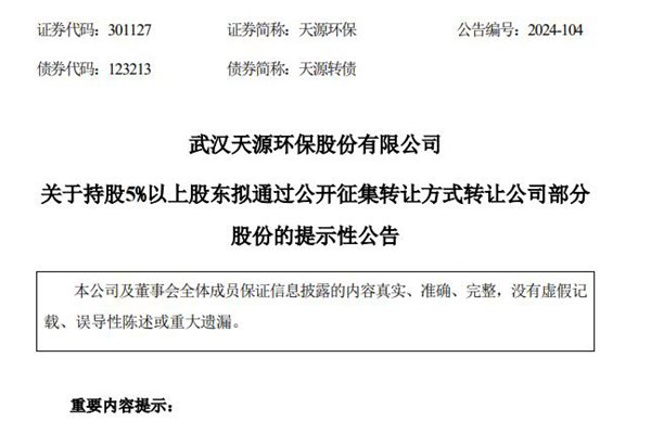 武汉天源环保股份有限公司(简称:天源环保)近日公告称,公司于9月18日收到康佳集团股份有限公司(下称“康佳集团”)发来的《康佳集团股份有限公司拟公开征集转让武汉天源环保股份有限公司部分股份的函》。 其中提到,康佳集团拟通过公开征集转让的方式协议转让其持有的天源环保30,000,000股股份,占天源环保剔除公司...