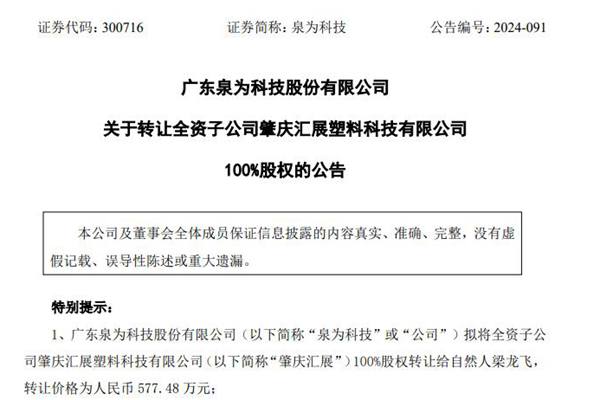 9月13日,A股光伏上市公司广东泉为科技股份有限公司(简称:泉为科技)接连发布转让全资子公司东莞市国立运动器材有限公司、东莞国立高分子材料有限公司及肇庆汇展塑料科技有限公司100%股权的公告,分别以1812万元、1850万元及577.48万元的价格,转让给自然人梁龙飞。 其中,运动器材公司注册资本为2000万元,截至2024上半年净...