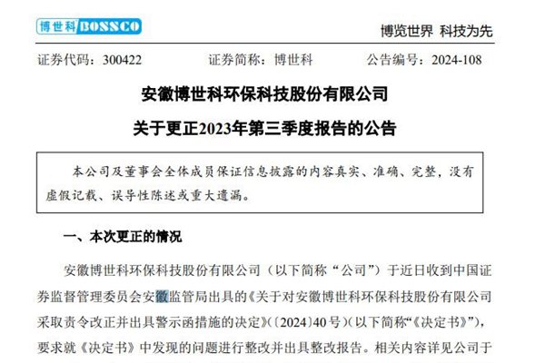 安徽博世科环保科技股份有限公司近日发布《关于更正2023年第三季度报告的公告》,应收账款从1,836,298,965.05元增至1,854,093,524.80元,增加约1779.5万元;合同资产从1,306,409,877.23降至1,186,310,378.24,减少约1.2亿元;流动资产合计从4,526,451,863.92元降...