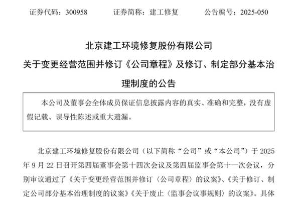北京建工环境修复股份有限公司(简称:建工修复)近日发布关于变更经营范围并修订《公司章程》及修订、制定部分基本治理制度的公告。 《公司章程》重要修订要点主要如下: 1、根据《上市公司章程指引》删除监事会及监事相关内容,相关职权调整至审计委员会。 2、根据公司业务发展的需要变更公司经营范围,增加园林绿化相关业务范围:“园...