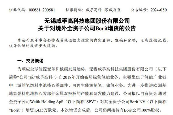 8月7日,无锡威孚高科技集团股份有限公司(下称:威孚高科)发布公告,公司拟以自有资金通过全资子公司Weifu Holding ApS(简称“SPV”)对其全资子公司IRD Fuel Cells A/S增资16200万丹麦克朗;对其全资子公司Borit NV(以下简称 “Borit”)增资...