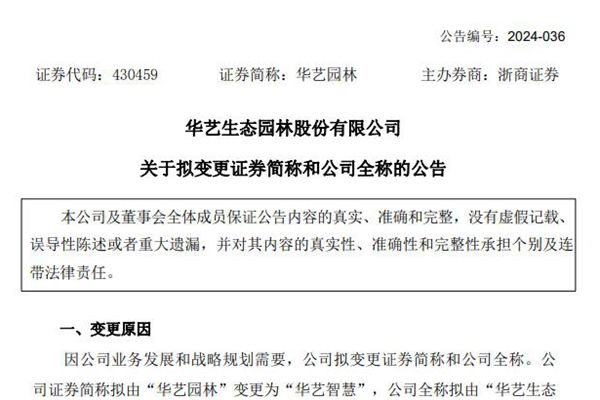 近日,华艺生态园林股份有限公司(简称:华艺园林)发布《关于拟变更证券简称和公司全称的公告》,全称将由“华艺生态园林股份有限公司”变更为“华艺智慧科技股份有限公司”,证券简称由“华艺园林”变更为“华艺智慧”。 华艺园林表示,本次拟变更公司全...