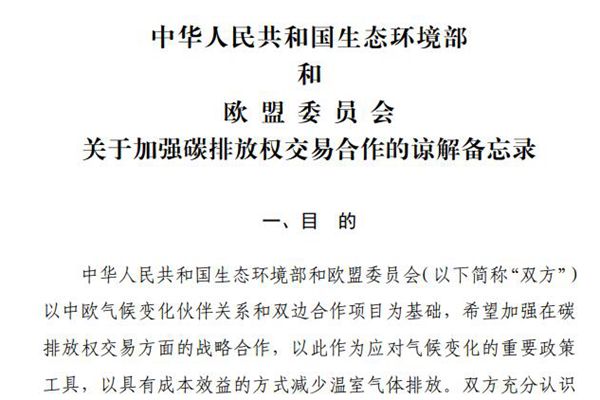8月1日,生态环境部网站正式发布中文版《中华人民共和国生态环境部和欧盟委员会关于加强碳排放权交易合作的谅解备忘录》,全文如下↓...