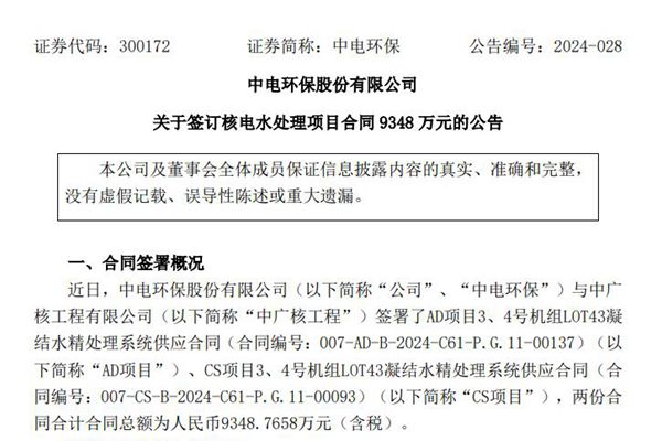 近日,中电环保股份有限公司(简称:中电环保)公告称,公司与中广核工程有限公司签订了核电水处理项目合同,金额超9348万元。具体内容为AD项目3、4号机组LOT43凝结水精处理系统供应合同、CS项目3、4号机组LOT43凝结水精处理系统供应合同,两份合同总额为人民币9348.7658万元。 业绩方面,2023年,中电环保实现营业收入1...