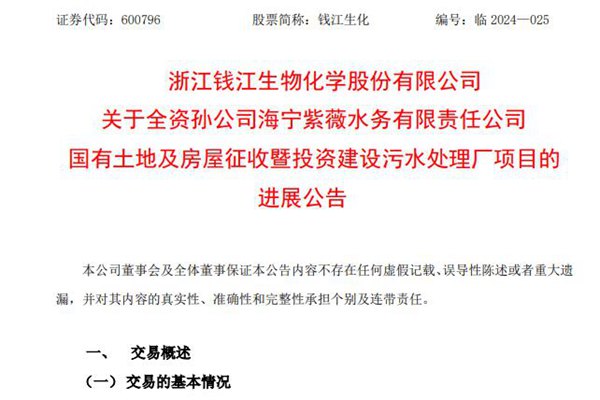 浙江钱江生物化学股份有限公司(简称:钱江生化)近日发布公告称,因政府征收房屋及其他附属物,公司子全资孙公司海宁紫薇水务有限责任公司(以下简称“紫薇水务”)于近期签署了《杭海新区污水处理厂易地新建项目政府三方补偿协议》,将获得 40,151.57 万元补助。 后续,本地块部分土地出让金用于补助杭海新区污水处理厂...