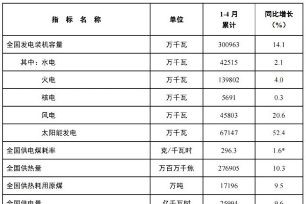 5月23日,国家能源局发布1-4月份全国电力工业统计数据。 截至4月底,全国累计发电装机容量约30.1亿千瓦,同比增长14.1%。其中,太阳能发电装机容量约6.7亿千瓦,同比增长52.4%;风电装机容量约4.6亿千瓦,同比增长20.6%。 1-4月份,全国发电设备累计平均利用1097小时,比上年同期减少49小时。其中,风电789小...