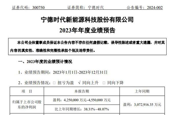 1月30日,宁德时代发布业绩预告,预计2023年净利润425亿元-455亿元,同比增长38.31%-48.07%。 对于业绩同比上升的主要原因,宁德时代表示,国内外新能源行业保持较快增长速度,动力电池及储能产业市场持续增长,“双碳”目标下向清洁能源转型趋势明确。公司作为全球领先的新能源创新科技公司,通过加大研...