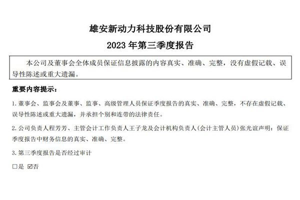近日,雄安新动力科技股份有限公司(简称:新动力)发布《2023年第三季度报告》。报告显示,新动力第三季度实现营业收入3415.91万元,同比增长29.45%;归属于上市公司股东的净亏损1911.25万元;归属于上市公司股东的扣除非经常性损益的净亏损1782.66万元;基本每股亏损0.0268元/股。 公开资料显示,新动力在全球范围内...