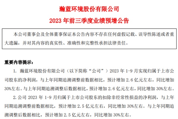 《瀚蓝环境股份有限公司2023年前三季度业绩预增公告》显示,2023 年 1-9 月实现归属于上市公 司股东的净利润,与上年同期追溯调整前数据相比,预计增加 2.6 亿元左右,同比增加 30%左右。与上年同期追溯调整后数据相比,预计增加 2.6 亿元左右,同比增加 30%左右。 2023 年 1-9 月归属于上市公司股东的扣除非经常...