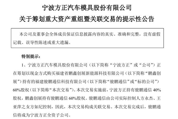 2025年04月16日,宁波方正汽车模具股份有限公司发布《关于筹划重大资产重组暨关联交易的提示性公告》。图源:宁波方正公告 宁波方正筹划以现金方式购买福建省鹏鑫创展新能源科技有限公司持有的福建骏鹏通信科技有限公司60%股权。 本次交易完成后,骏鹏通信将成为宁波方正全资子公司。 据骏鹏通信自己的招聘公告称,其专业从事新能源动力电池...