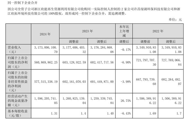 圣元环保股份有限公司(简称:圣元环保)近日发布《2024年年度报告》。报告期内,圣元环保实现营业收入约15.82亿元,同比减少9.49%;归属于上市公司股东的净利润约1.82亿元,同比增加24.29%;基本每股收益0.6702元,同比增加24.3%。图源:圣元环保公告 报告期内,圣元环保主营业务为经营城镇固液废专业化处理,主要业务包...