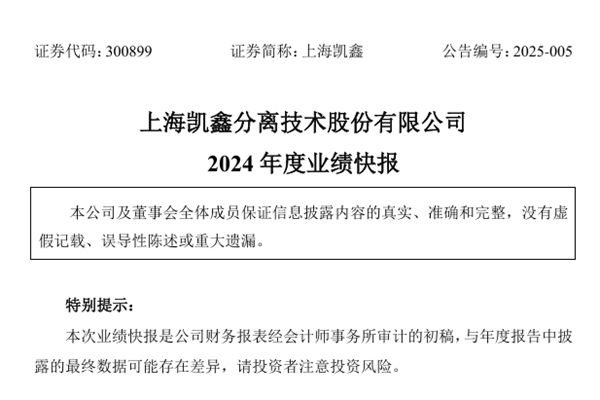 上海凯鑫分离技术股份有限公司(简称:上海凯鑫)近日发布《2024年度业绩快报》。报告期内,上海凯鑫实现营业总收入8,160.59万元,同比减少34.52%;归属于上市公司股东的净利润亏损164.62万元,同比减少110.56% ;基本每股收益亏损0.0258。图源:上海凯鑫公告 截至2024年年末,上海凯鑫总资产为79,214.23...