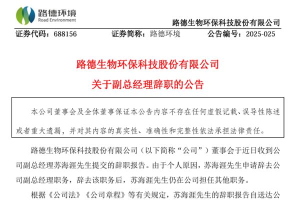 路德生物环保科技股份有限公司(简称:路德环境)近日公告称,由于个人原因,苏海涯先生申请辞去公司副总经理职务,辞去该职务后,苏海涯先生仍在公司担任其他职务。图源:路德环境公告 申明:本站发布此信息的目的在于传播更多信息,与本站立场无关。并且郑重提示所有阅读者,股市有风险,投资需谨慎,本文不作为任何投资的参考意见和依凭。...