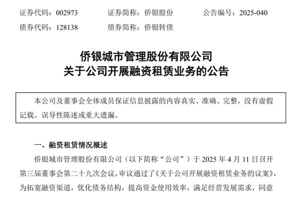 侨银城市管理股份有限公司(简称:侨银股份)4月15日公告称,为拓宽融资渠道,优化债务结构,提高资金使用效率,满足经营发展需求,同意公司作为承租人与上海爱建融资租赁股份有限公司(下称“爱建租赁”)开展融资租赁业务(包括售后回租形式),总融资金额不超过5,000万元,融资期限不超过36个月。侨银股份以其持有的环卫车...
