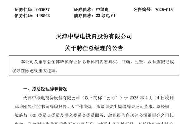 天津中绿电投资股份有限公司(简称:中绿电)公告称,因工作变动,孙培刚先生提请辞去公司董事、总经理、战略与 ESG 委员会委员及提名委员会委员职务,辞职报告自送达公司董事会之日起生效,孙培刚先生辞职后将不在公司任职。 4月15日,中绿电召开第十一届董事会第十五次会议,以8票赞成、0票反对、0票弃权,审议通过了《关于聘任总经理的议案》。...