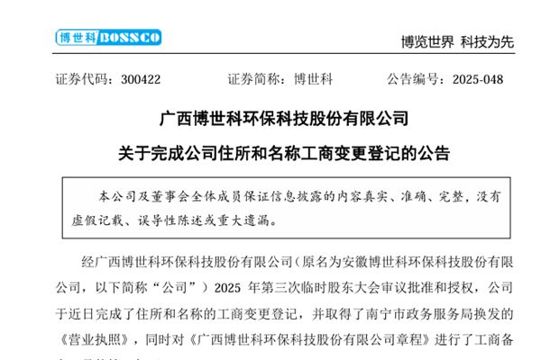 广西博世科环保科技股份有限公司(简称:博世科)4月10日公告称,公司已经完成了住所和名称的工商变更登记,并取得了南宁市政务服务局换发的《营业执照》。具体情况如下:图源:博世科公告 博世科表示,公司名称、住所变更后,公司主营业务未发生变化。公司证券简称“博世科”、证券代码“300422”...
