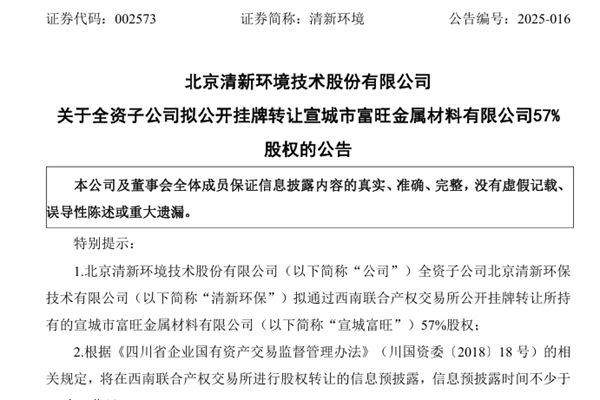 北京清新环境技术股份有限公司(简称:清新环境)4月3日公告称,全资子公司北京清新环保技术有限公司(下称“清新环保”)拟通过西南联合产权交易所公开挂牌转让所持有的宣城市富旺金属材料有限公司(下称“宣城富旺”)57%股权,信息预披露时间不少于20个工作日,评估结果尚需履行国有资产管理部门的核...