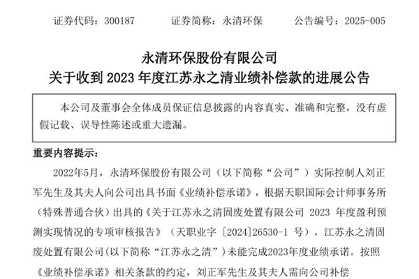 永清环保股份有限公司(简称:永清环保)近日发布《关于收到2023年度江苏永之清业绩补偿款的进展公告》。公告显示,永清环保已收到业绩补偿款68,455,342.88元。 据悉,2021年,永清环保和控股股东签订了《股权转让协议》等,宣布以现金25,500万元收购,江苏永之清固废处置有限公司(下称“江苏永之清”)...