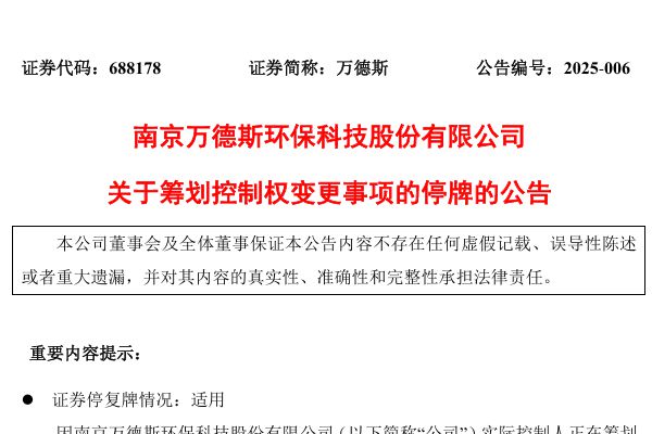 南京万德斯环保科技股份有限公司(简称:万德斯)近日公告称,因公司实际控制人正在筹划重大事项,该事项可能导致公司控制权变更,鉴于该事项存在重大不确定性,为保证公平信息披露,维护投资者利益,避免造成公司股价异常波动,根据《上海证券交易所科创板股票上市规则》等有关规定,经公司向上海证券交易所申请,公司股票自2025年3月17日(星期一)起停...