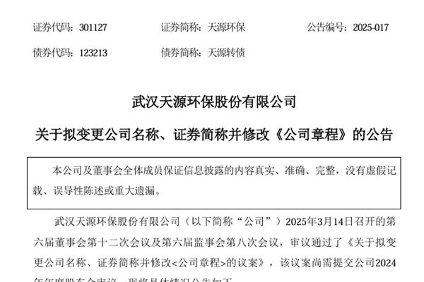 武汉天源环保股份有限公司(简称:天源环保)公告称,公司召开的第六届董事会第十二次会议及第六届监事会第八次会议,审议通过了《关于拟变更公司名称、证券简称并修改的议案》,具体如下:图源:天源环保公告 天源环保表示,此次更名主要是为了进一步满足因公司主营业务变化带来的经营发展需要,配合公司的战略规划实施,体现公司“环保+能源&...
