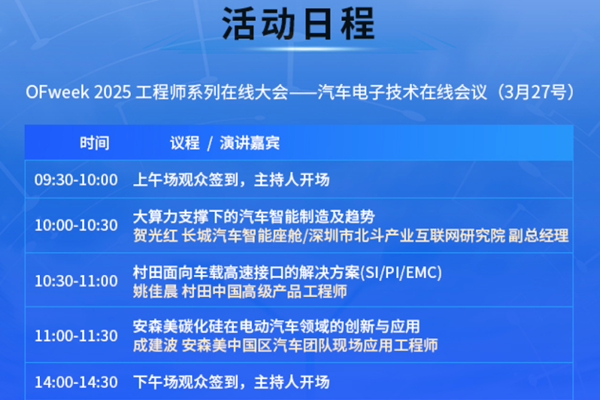 随着 5G、人工智能、物联网、无人驾驶等新兴信息技术的蓬勃发展,汽车电子领域正迎来前所未有的变革,也对行业从业人员提出了越来越高的技能要求,电子工程师必须及时掌握新技术,才能更好地跟上行业发展的步伐。 为了助力电子工程师、技术人员紧跟行业前沿动态,OFweek 电子工程网将于 3 月 27 日举办 “OFweek 202...